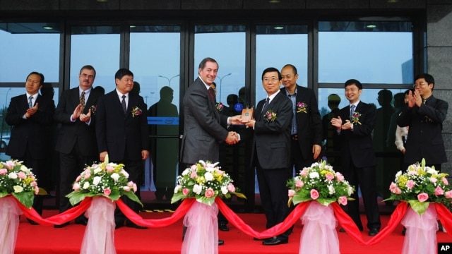 A 2006 photo shows Intel CEO Paul Otellini (C-L) presenting a gift to Li Chuncheng, who was secretary of Chengdu Municipal Committee of the Communist Party, during the completion ceremony of the second project of Intel Products Chengdu Ltd. in Chengdu, Sichuan province.